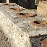 The House of the Wooden Tramezzo was built in the pre-Roman age, around the 1st century BC. The house has a typical patrician facade that ends with an oval cornice while at the base it has masonry seats used by waiting clientes before being received by the owner; along the walls of the entrance jaws there remain traces of stucco on which frescoes had been made, but these are faded by time. On the east side of the atrium is the tablinum: the two rooms are divided by means of a partition, i.e., a kind of folding door, as tall as a man, made entirely of wood, charred as a result of the eruption, with shaped doors and large bronze rings on which lamps were rested.